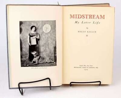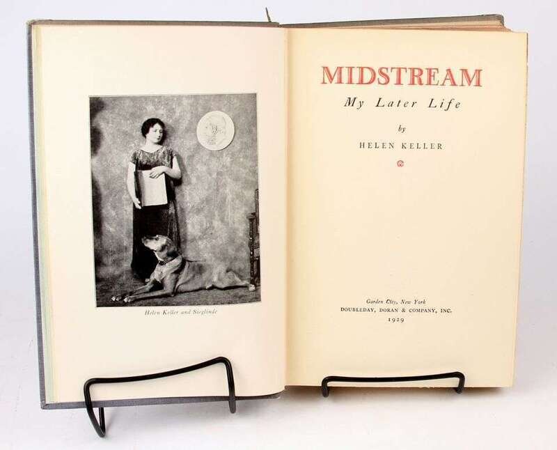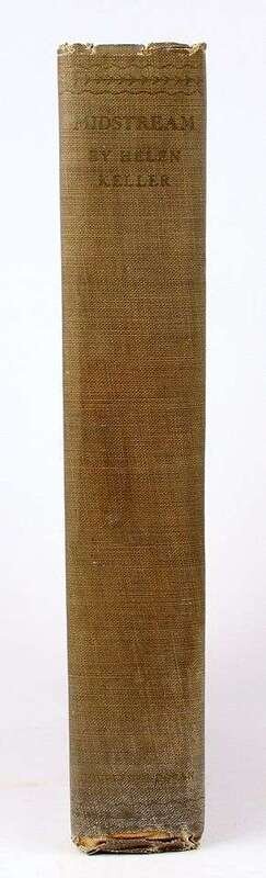 Keller, Helen. Midstream: My Later Life. Garden City, 1929. 8vo, orig slate-blue cloth, top edge stained dark pink, other edges untrimmed; some edge wear, spine starting to discolor. Photo plates. Inscr "sincerely yours," & signed on front free endpaper recto by Helen Keller.