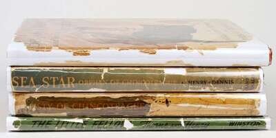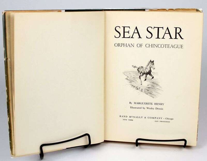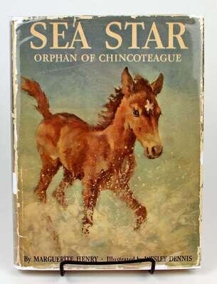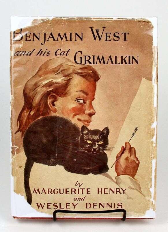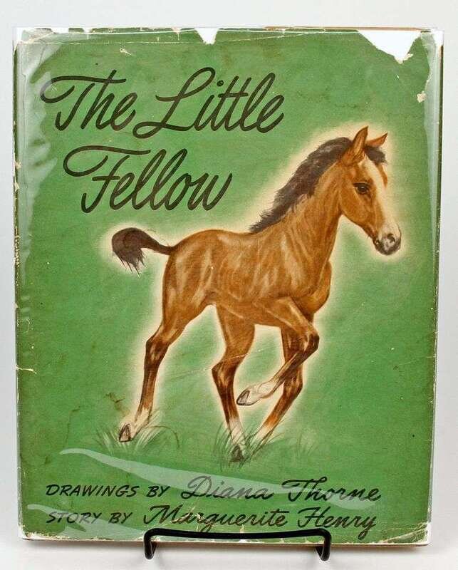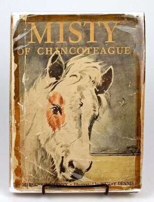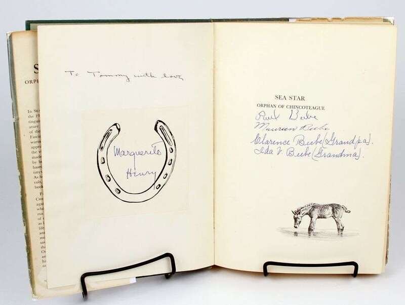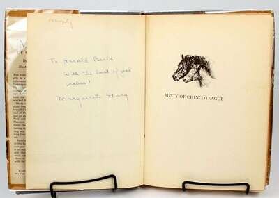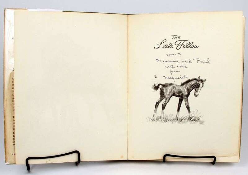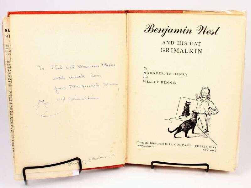 Marguerite Henry Chincoteaque Presentation Copies to Beebe Family Members, The Models for Her Principle Human Characters: Henry, Marguerite. The Little Fellow. Philadelphia: John C. Wintson, [1945]. 4to, orig pictorial green cloth; some dampstaining & edge wear, d/j (often chipped, some dampstaining & wrinkling, price clipped). Illus by Diana Thorne. Inscr & signed on half-title, "[The Little Fellow] comes to Maureen and Paul with love from Marguerite." * Misty of Chincoteaque. New York, etc.: Rand McNally, [1947]. 4to, orig pictorial slate-blue cloth; moderate wear, d/j (chipped, creased & worn, crudely repaired). Inscr to Harold Beebe & signed by Marguerite Henry. * Sea Star, Orphan of Chicoteaque. New York, etc.: Rand McNally, [1949]. 4to, orig pictorial green cloth; light wear, d/j (chipped at joints & edges). Illus by Wesley Dennis. Inscr & signed on verso of front free endpaper by Marguerite Henry. Also signed on half-title by Paul, Maureen, Clarence & Ida Beebe. * Benjamin West and His Cat Grimalkin. Indianapolis: Bobbs-Merril, [1947]. 4to, orig gilt-lettered red cloth; light to moderate wear, d/j (chipped, spine gone, other paper loss). Illus by Wesley Dennis. Inscr to Paul and Maureen Beebe & signed by Marguerite Henry on half-title, further embellished with a pen & ink drawing of the cat, Grimalkin. All 1st or presumed 1st eds.