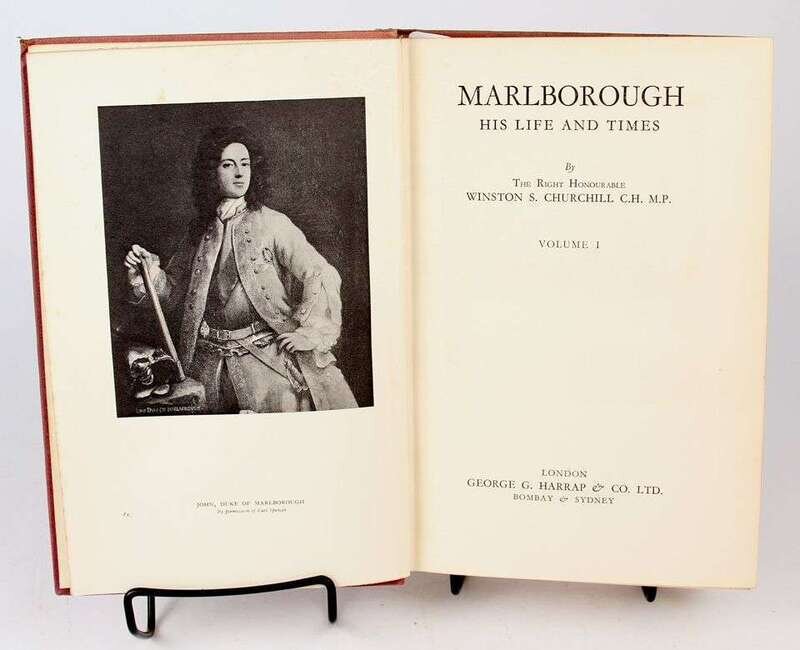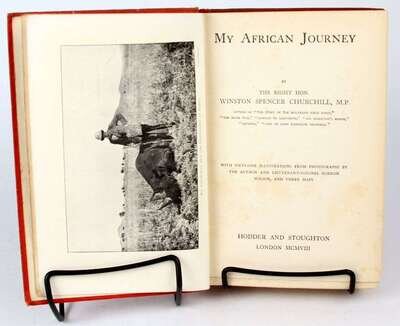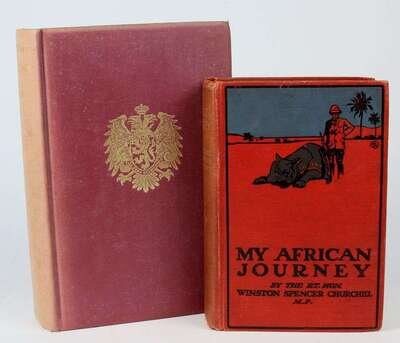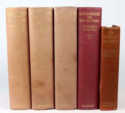 Churchill, Winston Spencer. My African Journey. London: Hodder and Stoughton, 1908. 1st ed, orig pictorial red cloth, gilt-lettered spine; light edge wear, occasionally slightly scuffed. With 3 masp, photo plates. Scattered light foxing. Pub cat at back - 1 leaf + 16pp. Lacking half-title, fly-leaves, last advt leaf & back free endpaper. All photo plates present. * Marlborough, His Life and Times. London: George G. Harrap, [1933-1938]. 1st ed. 4 vols. 8vo, orig purple cloth, gilt, t.e.g., gilt-lettered spine; spines faded, slightly scuffed. Plates. Some foxing to front & back matter.