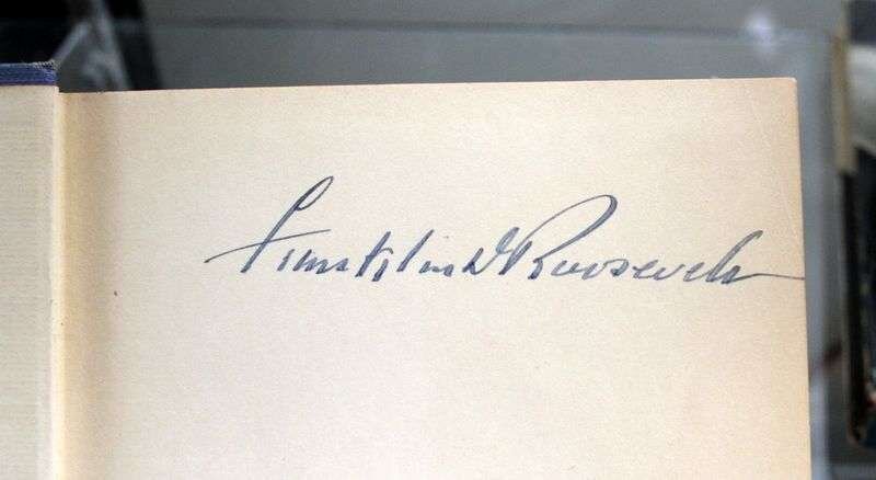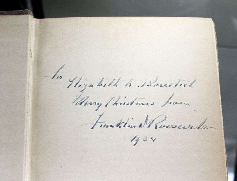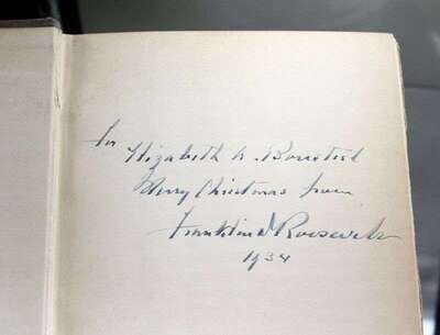 (Rooselvelt, Franklin D.:) Roosevelt, Franklin D. On Our Way. New York: John Day, [1934]. 1st ed. 12mo, orig blue cloth; head of spine & front cover sunned. Presentation copy, inscribed "Merry Christmas to Elizabeth Bonsteel," signed & dated "1934." by Roosevelt on front free endpaper recto. * Thompson, Maurice. Alice of Old Vincennes. New York: Grossett & Dunlap, [ca 1935]. 12mo, orig cloth; light wear. Signed by Roosevelt at head of front free endpaper.