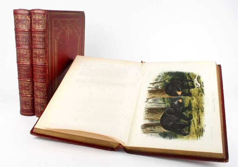 Audubon, John James; Bachman, John. The Quadrupeds of North America. New York, 1852-1854. Lg 8vo, orig pub richly gilt burgundy morocco, a.e.g.; moderately scuffed, spines & joints occasionally rubbed, very occasionally blistered, head of vol 3 spine starting to tear. With 155 hand-colored lithos, tissue guards. Scattered, generally light foxing to plates, occasional minor dust smudging to plates in vol 1. 1st ed of vol 3, later ptgs of vols 1 & 2.