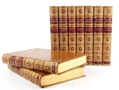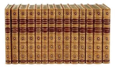Meredith, George. The Works. London: Constable, 1909-1911. Memorial Edition. 8vo, contemp full triple-gilt fillet paneled polished tan calf, richly gilt floral spine compartments, a.e.g., turn-ins gilt, purple silk endpapers, russet morocco spine labels, gilt floral brown morocco lozenge spine & corner onlays, by Zaehnsdorf; occasionally scuffed, spine ends often slightly scuffed, bands intact. Plates. Internally crisp & clean. Attractive set.