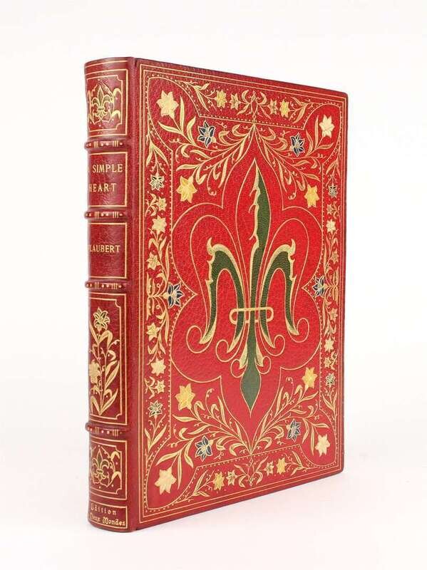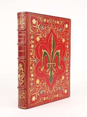 (Société des Beaux Arts.) Flaubert, Gustave. A Simple Heart. Paris, n.d. [ca 1898]. Edition des Deux Mondes, 1/20 on Japon vellum, letter "a." Lg 8vo, contemp full richly gilt paneled & foliate crushed scarlet morocco with green, blue & white gilt-decorated morocco cover & spine onlays, richly gilt foliate turn-ins, crushed green morocco doublures with hand-painted vellum oval onlay at front, silked endpapers, t.e.g., other edges rough cut, raised bands; very occasional, very minor edge wear. Illus by Emile Adan, triple suite of engraved plates: plain, color & India proof. Bookplate of Alice Maude Howes. Bright, sound & attractive.