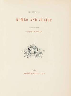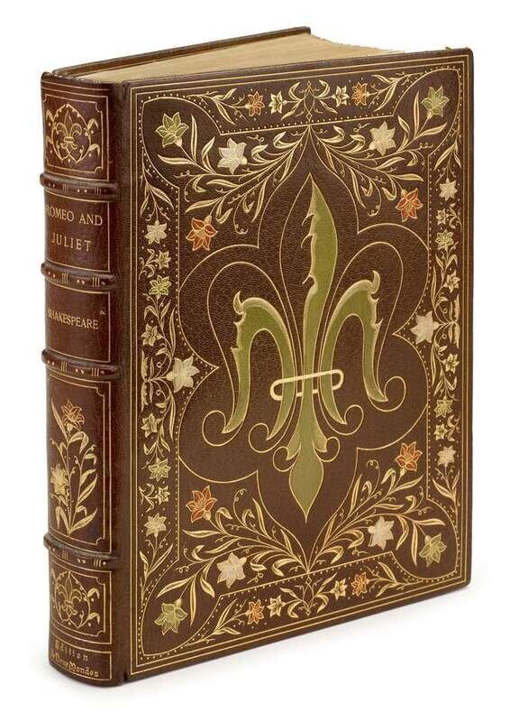 (Société des Beaux Arts.) Shakespeare, [William]. Romeo & Juliet. Paris, n.d. [ca. 1895]. Edition des Deux Mondes, 1/20 on Japon vellum, out-of-series copy. Lg 8vo, contemp full richly gilt paneled & foliate crushed brown morocco with green, red & white gilt decorated floral morocco cover & spine onlays, richly gilt foliate turn-ins, crushed green morocco doublures with hand-painted vellum oval onlay at front, silked endpapers, t.e.g., other edges rough cut, raised bands; top fore-edge of covers moderately rubbed. Illus by J. Wagrez & Louis Titz, text illus, triple suite of engraved plates: plain, colored & India proof. Bookplate of Alice Maude Howes. Bright, sound & attractive.