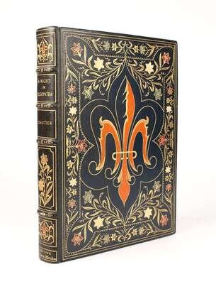 (Société des Beaux Arts.) Gautier, Theophile. A Night of Cleopatra. Paris, n.d. [ca 1895]. Edition des Deux Mondes, 1/20 on Japon vellum, out-of-series copy. Lg 8vo, contemp full richly gilt paneled & foliate crushed blue morocco with gilt decorated orange, blue, purple & white morocco cover & spine onlays, richly gilt foliate turn-ins, gilt morocco doublures with hand-painted vellum oval onlay at front, silked endpapers, t.e.g, other edges rough trimmed, raised bands; a few small rubbed areas on top third of the cover fore-edges. Illus by Paul Avril, triple suite of engraved plates: plain, color & India proof. Bookplate of Alice Maude Howes. Bright, sound & attractive.