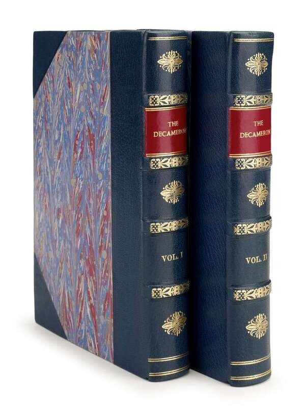 Boccaccio, Giovanni. The Decameron. London: Lawrence and Bullen, 1893. #159/174. Translated by John Payne. Illus by Louis Chalon. 4to, mid-20th-century 3/4 crushed blue niger morocco & marbled bds, spines gilt, raised bands, red morocco spine labels. Photogravure plates. Internally clean, bright bdg.