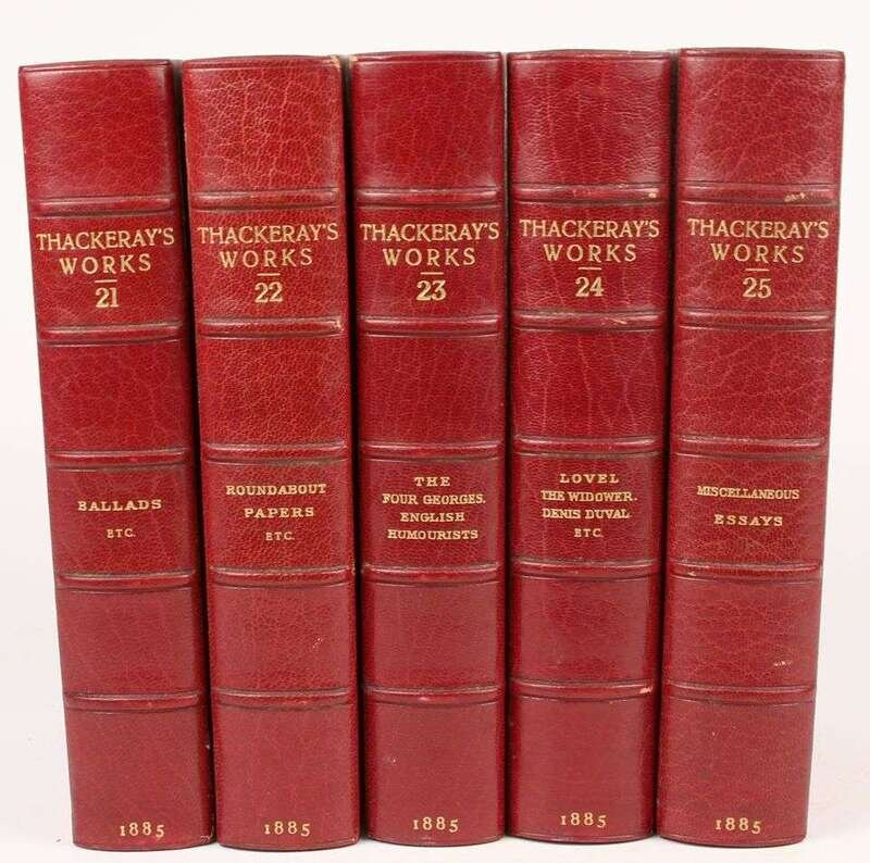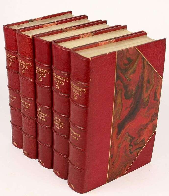 Thackeray, William Makepeace. Works. London: Smith, Elder, 1883-1886. 8vo, early 20th-century 3/4 crushed burgundy levant morocco & marbled bds, raised bands, gilt, a.e.g., by Brentanos; joints & corners occasionally scuffed, spine head of vol 8 rubbed, front joint of vol 1 rubbed & broken, front cover detaching, spine head of vol 14 chipped. Portrait, plates, other illus by Thackeray, et al. Internally clean & crisp, with exception of vol 1 & minor scattered wear to other vols. Bright sound & attractive.
