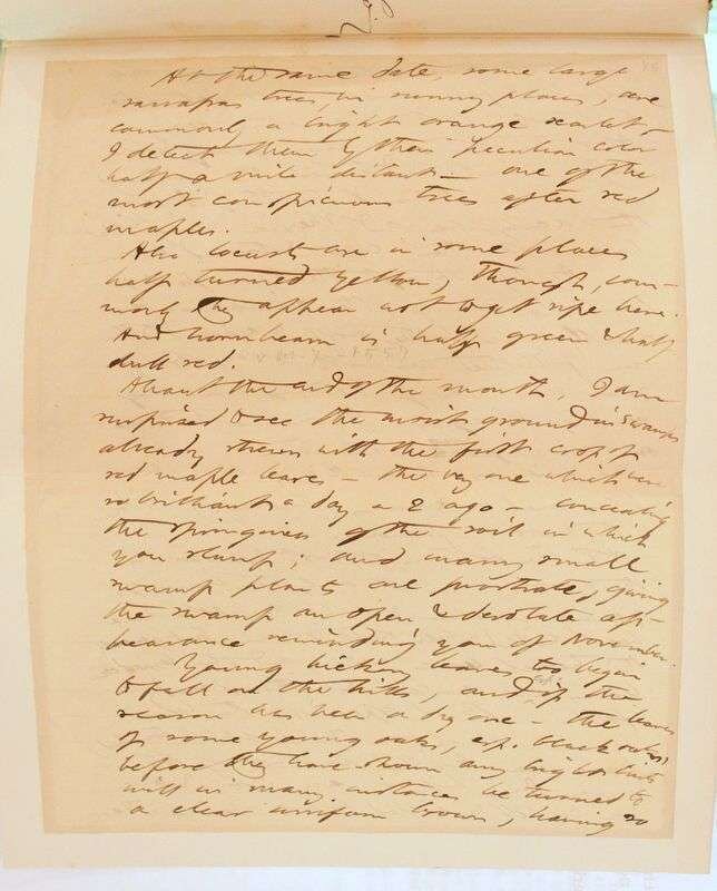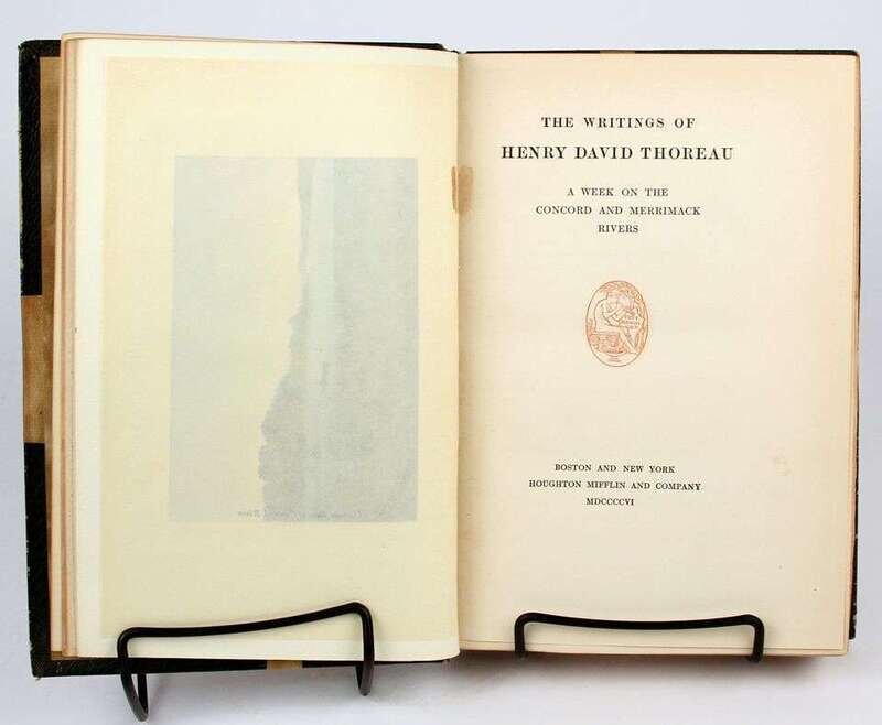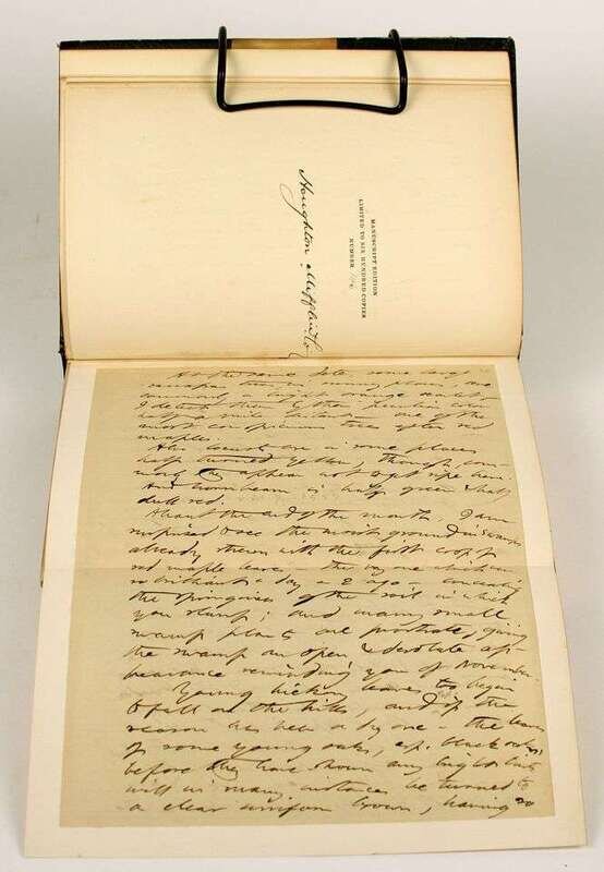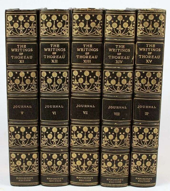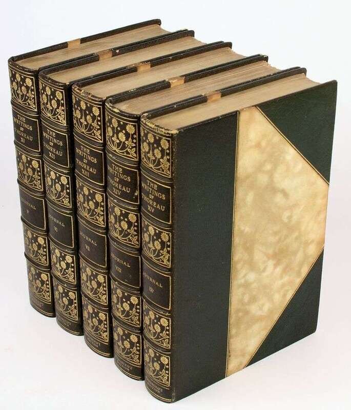 Thoreau, Henry David. The Writings of... Boston: Houghton Mifflin, 1906. Manuscript Edition, #146/600, with leaf of autograph manuscript in vol 1. 8vo, contemp 3/4 crushed green morocco, gilt, richly gilt floral spine compartments, t.e.g., other edges untrimmed; spine ends often rubbed, a few spine heads starting to detatch, heads of vols 4, 6, 12 & 14 heavily rubbed, front joint of vol 1 rubbed, bands intact. With 103 plates & fold map. Internally clean. Merle Johnson p502.