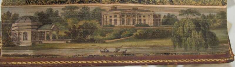 Fore-Edge Paintings: Rogers, Samuel. Poems. London, 1812. Sm 8vo, later purple straight-grained morocco, guilt prize bdg, a.e.g.; scuffed, joints rubbed. With fore-edge painting of Lambton Castle, Durham. * Goldsmith, Oliver. The Poems. London, 1819. 12mo, contemp gilt & blind-paneled calf, richly gilt spine compartments, a.e.g, morocco spine label; scuffed, joints rubbed. With additional engraved title & engraved part titles. Scattered light foxing. With fore-edge painting of Mr. Garrick's house.