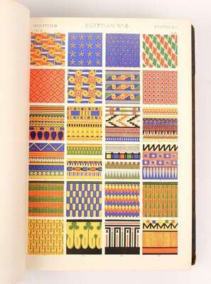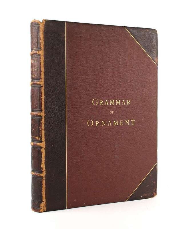 Jones, Owen. The Grammar of Ornament. London: Bernard Quaritch, 1868. Folio, contemporary 3/4 black morocco & pebbled cloth, gilt; joints rubbed. With additional chromolitho title & other litho plates (some heightened with gold). Front free endpaper & blank detached. Internally clean & crisp.