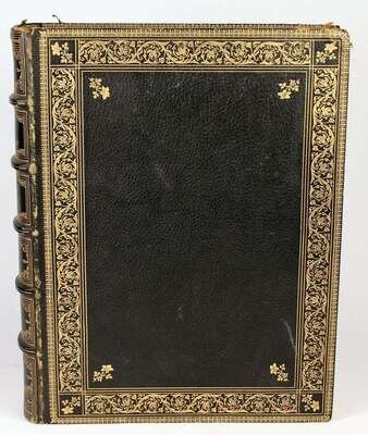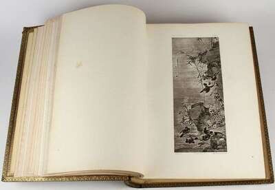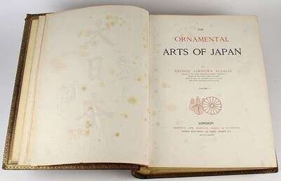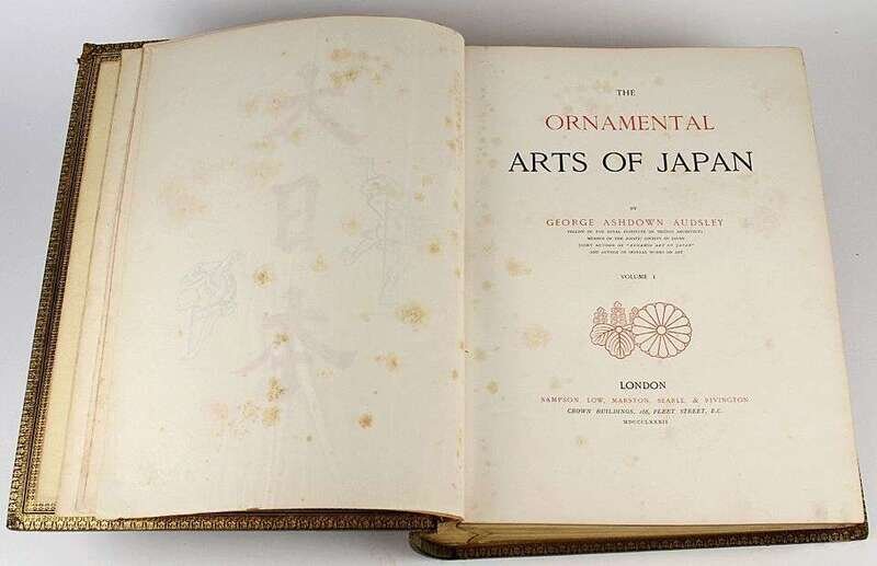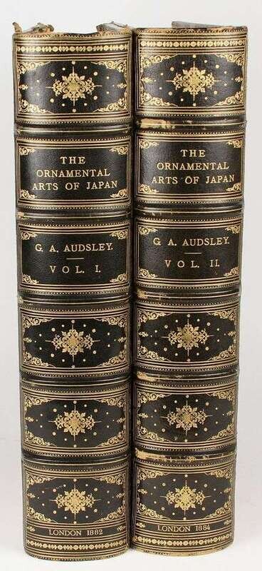 Audsley, George Ashdown. The Ornamental Arts of Japan. London: Sampson, Low, Marston, Searle, & Rivington, 1882-[1885]. Folio, orig richly gilt paneled & foliate black morocco, gilt spine compartments, inner dentelles gilt, raised bands; corners, spine ends & joints often rubbed. 9 parts in 2 vols. With frontises, 70 chromolitho plates, 35 plain plates, text illus. Light to moderate foxing to title-pages & front matter, other scattered mostly light foxing. Chromo plates generally clean.