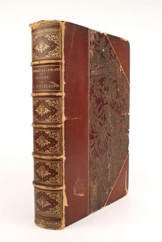Jacquemart, Albert; Le Blant, Edmond. Histoire artistique industrielle et commerciale de la porcelaine. Paris: J. Techener, 1862. Folio, contemporary 3/4 brown morocco, gilt & pictorial metal onlaid bds; joints & extremities heavily rubbed, original pink wrappers bound in. With 26 engraved & etched plates by Jules Jacquemart. Internally clean. Untrimmed.