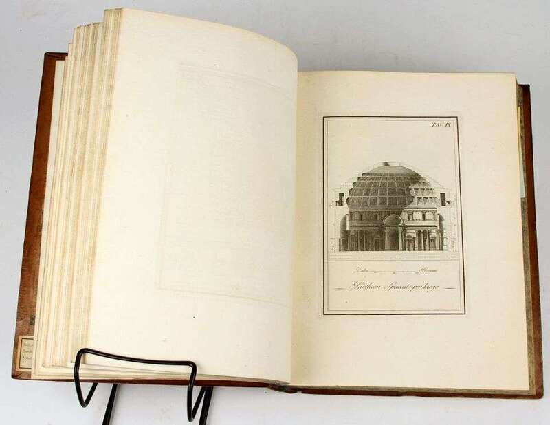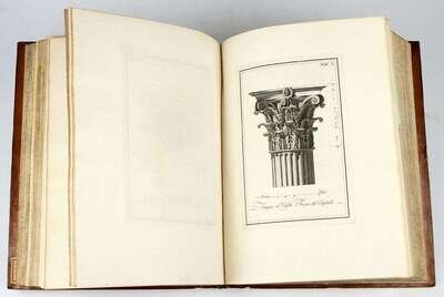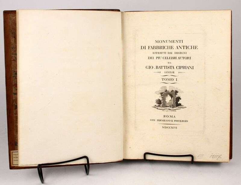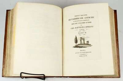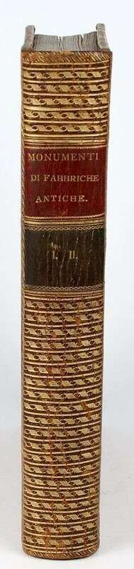 Cipriani, Giovanni Battista. Monumenti di fabbriche antiche estratti dai disegni dei piu celebri autori. Rome, 1796, 1799. 4to, contemp tree calf, richly gilt spine, green & burgundy morocco labels; joints & extremities often rubbed. Engraved throughout, general titles, part titles, text & content leaves + 155 plates (& 2 fold tables). Internally generally crisp & clean. Ex-library stamp on verso of vol 1 title page.