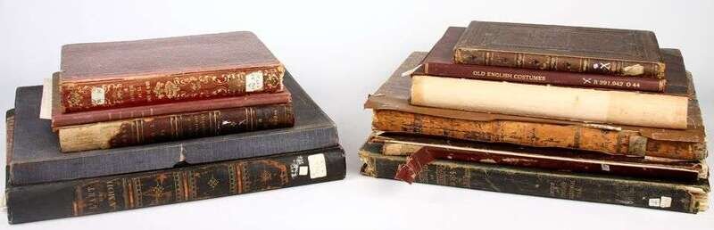 Costume &C: Walker, George. The Costume of Yorkshire ... Leeds, 1885. #332/600. Folio, orig cloth; worn & defective. 40 color plates. Generally clean. * Wingfield, Lewis. Notes on Civil Costume in England. London: 1884. Parts 1-3. 4to, orig morocco, gilt; joints rubbed, other wear. With 24 chromolitho plates. * Harrod's. Old English Costumes. London: V & A, [ca 1910.] 4to, orig wrappers. Photo illus. * "Costumes Estrangers." [Paris, ca 1860.] 4to, modern bds. 20 hand-colored litho plates. * Perugini, M.G. Collection complete des costumes de la cour de Rome ... Paris, 1852. 4to, orig morocco & bds; rubbed & worn. Approx 80 hand-colored plates. Some dampstaining. * Allon, Thomas. Character and Costume of Turkey & Italy. London: Fisle & Son, [1839]. Folio, contemp russia; defective. Additional pictorial title & 20 tinted litho plates. Some dampstaining. * Strutt, Joseph. The Regal and Ecclesiastical Antiquities of England. London, 1793. 4to, contemp calf; worn, front cover detached. 72 plates. * Shelton, Joseph. Engraved Illustration & Antient Arms & Armour. London: 1830. Vol 2 only. Sm folio; bdg defective. Plates. * L'Art de la mode. Paris, 1881. Vol 2 only. Folio, bdg defective. Color plates, other illus. * Willemin, Nix. Choix de costumes ... de l'antiquite. Paris, 1798. Vol 1 only. Folio, bdg defective. 78 engraved plates. * Gray, Thomas. Designs by R. Bently for Six Poems. London: 1753. Old wrappers. Incomplete. All ex-library. Sold with all faults.
