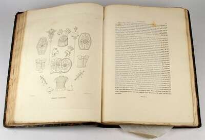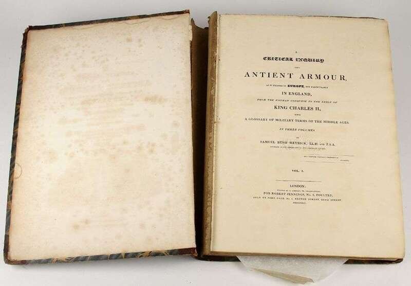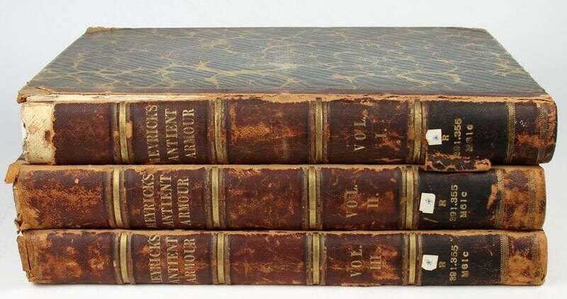 Meyrick, Samuel Rush, Sir. A Critical Inquiry into Ancient Armour. London: Robert Jennings, 1824. 1st ed. Lg 4to, contemp 1/4 morocco & marbled bds; joints, spines, bds & corners heavily rubbed, other moderate wear. With additiional engraved titles, 80 engraved plates (70 hand-colored), colored initials. Light to moderate foxing to engraved & letterpress titles, scattered light foxing to text & a few plates - plates generally clean & bright. Untrimmed & partly unopened. Ex-library, perforated stamp on letterpress titles, ink markings at foot of dedication page in vol 1 & at foot of p1 in vols 2 & 3.