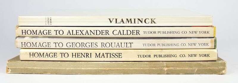 Modern Art Periodicals &C: (XXe Siecle Review.) Homage to Calder. [New York: Tudor, 1972]. 4to, orig cloth; minor wear, d/j (light edge wear). Color plates, other illus, incl orig color litho by Alexander Calder. Remainder stamp on front paste-down. * (_ _). Homage to Henri Matisse. [New York: Tudor, 1970]. 4to, original cloth; light wear, d/j (occasional minor dust soiling). Color plates, other illus, incl orig linocut by Matisse. * (_ _). Homage to Georges Rouault. [New York: Tudor, 1971]. 4to, original cloth, d/j. Light wear. Color plates, other illus., incl litho after Rouault. Minor smudging to endpapers. * Verve. [Paris, 1939]. Nos. 5/6. Folio, orig pictorial wrappers; cellotape repair to spine, some wear to joints & edges. Color plates, other illus, incl color & b/w lithos after G. Braque, G. Reuault, H. Matisse, et al. * Orlan, Pierre Mac. Vlaminck. New York: Universe; Monte-Carlo: A. Sauret, 1958. #41/2000. 4to, orig color, pictorial wrappers. Color plates, incl orig litho signed by Vlaminck. Bdg breaking. All internally clean.
