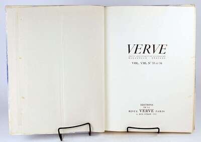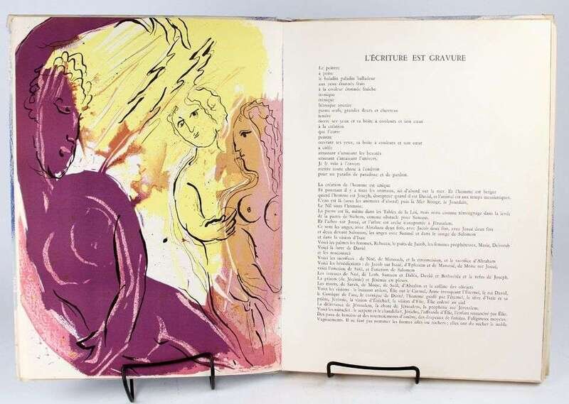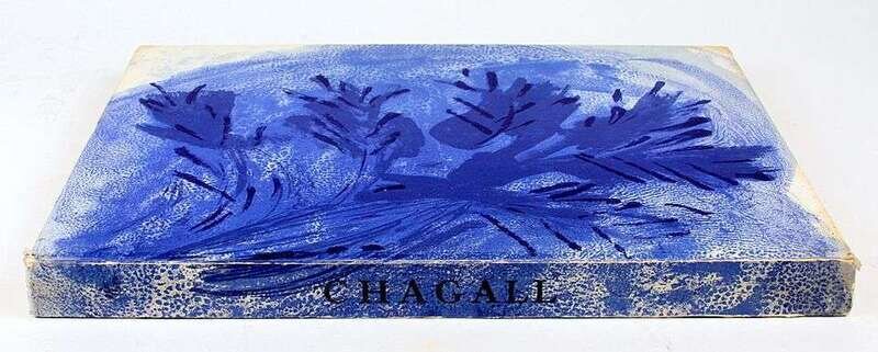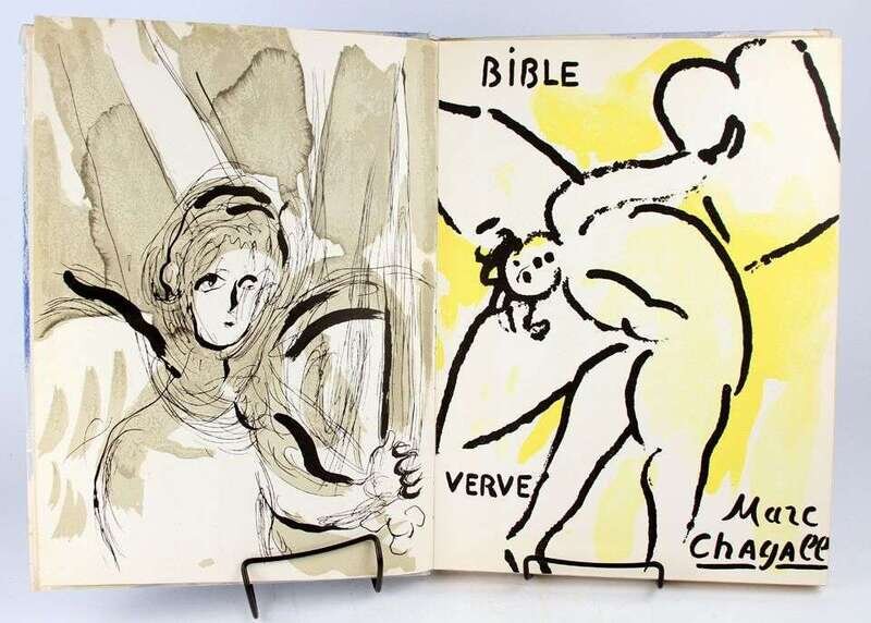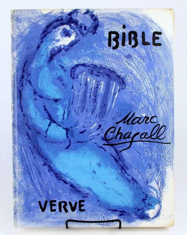 Chagall, Marc. Bible. Paris, 1956. Verve Nos. 33/34. Folio, orig pictorial litho bds by Marc Chagall; spine ends & joints occasionally scuffed, corners protected by transparent tape. With 16 color & 12 plain lithos by Chagall. Scattered light foxing at the fore-edge border of Verve title page, vertical crease & discoloration to front free endpaper, very scattered & very light foxing to fore-edge.