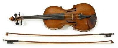 The solid spruce top and back with maple neck and sides, ebony fingerboard and tailpiece, rosewood tuning pegs, bearing paper label for Joseph Gagliano; together with two bows, one stamped H.R. PFRETZSCHNER, the other stamped illegibly, in patent leather carrying case with embroidered violin cover.