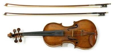 The solid spruce top and back with maple neck and sides, ebony fingerboard and rosewood tuning pegs; together with two bows, the violin bearing a paper label for Andrea Castagneri, one bow stamped TOURTE, in an alligator printed carrying case.