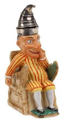 The painted and glazed ceramic seated figure of Punch in orange and yellow striped jester's motley and with silver mounted sugarloaf hat, painted registry mark to underside.