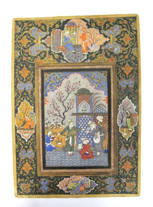 Painted to show a courtyard scene with five figures, two holding books and one presenting flowers, with architecture behind them, within an ornate scroll border with four inset paintings, of figures beside trees, laid onto card.