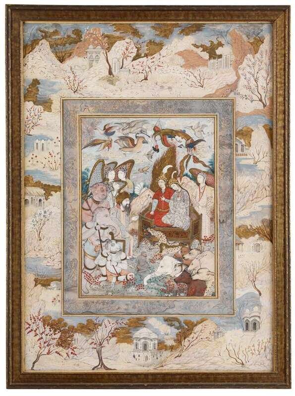 The leaf painted in rich detail to show a host of men, beasts, birds and mythological creatures paying homage to a seated prince and his consort, perhaps the Mughal heir Sulaiman Shikoh; the wide border painted to show white marble Mughal architectural structures among flowering trees and bushes, framed and glazed.