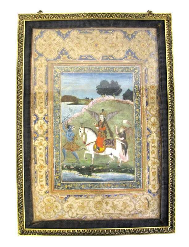 Painted to one side with scene of a mounted and winged deva escorted through a waterside meadow by a winged attendant and blue-skinned bestial figure within a wide, gilt-decorated border containing floral cartouches; painted verso to show songbirds above vivid blossoms emerging from a painted urn, bordered with a simpler floral pattern and inscribed; framed and double glazed.