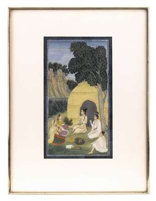Moghul style Indian miniature painting "A Royal Yogini Receives a Visit" circa 1700