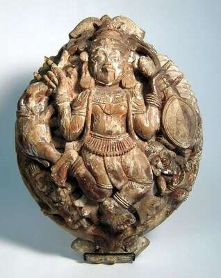 Oval plaque carved in high relief to show central guardian flanked by attendants, signs of polychrome.
