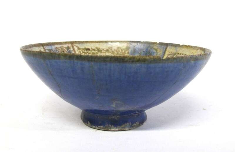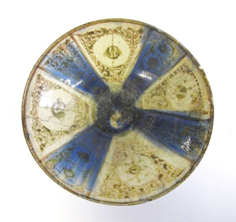 Circular footed U-form, the interior with alternating panels of cream and indigo glaze with decoration of arabesques, the exterior with indigo glaze.