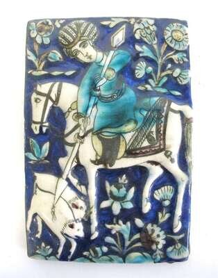 Rectangular form, depicting a horse-mounted hunter with spear and hogs amonbgst a cobalt and turquoise landscape.