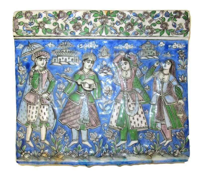 Rectangular, relief molded to show four figures dancing and playing music, below a floral frieze, decorated in blue, green and pale pink.