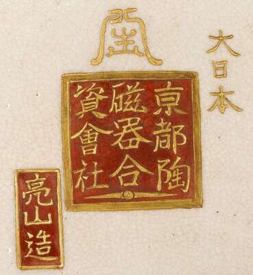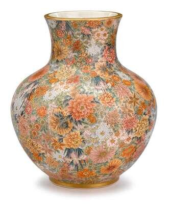 The large bulbous form finely and elaborately polychrome and gilt painted in the round with blossoms of chrysanthemum, peony, iris, lily, wisteria, and others, against a gilt stipple ground, marked for Ryozan and Kyoto Porcelain, Yasuda Company trademark and seal Kyoto Tojiki Goshigaisha, Dainippon Okamoto Ryozan.