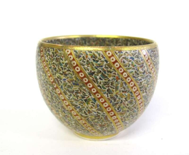 The circular bowl profusely and intricately painted and gilt to show a ground of polychrome butterflies and stripes.