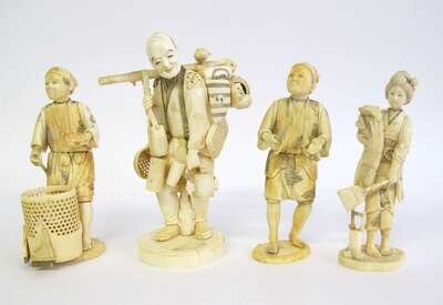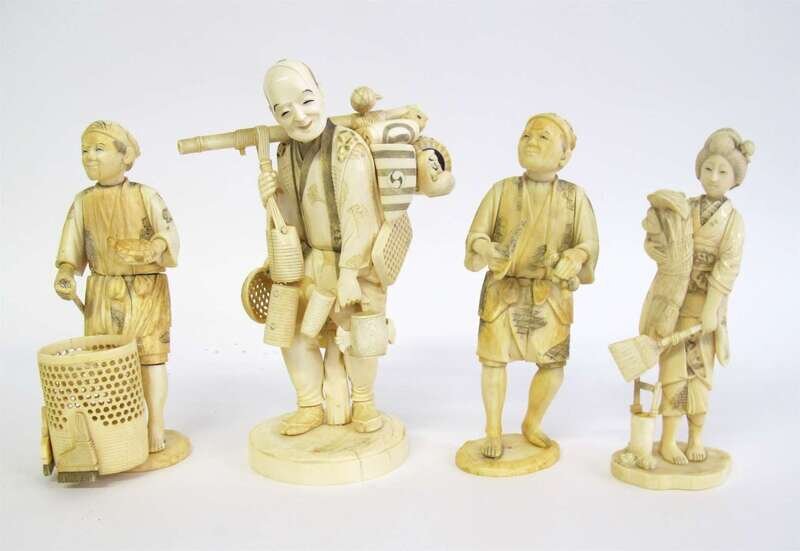 Comprising a merchant carrying his wares, tradesmen with turtle and ginger root and shears, and geisha with broom and foliate stalks, some signed.