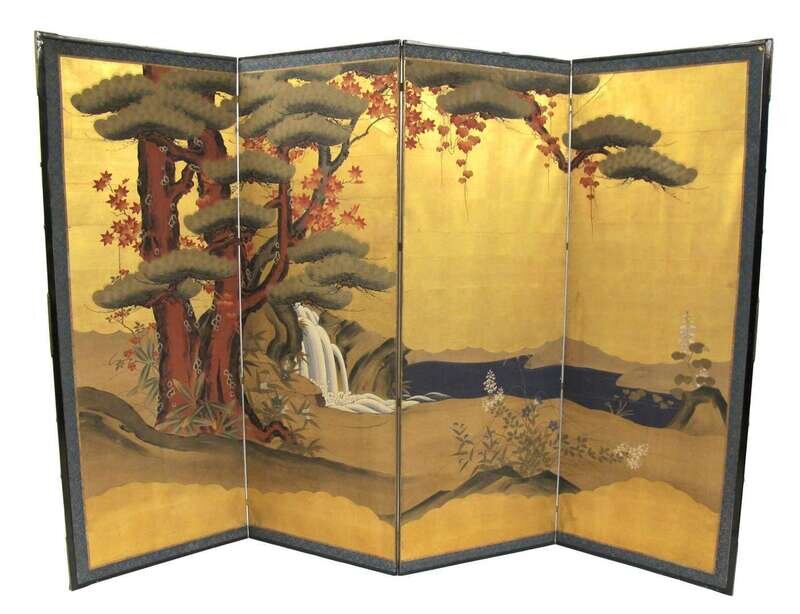 Painted to depict a serene landscape of a waterfall amongst a foliate tree and blossoming flowers, on a gilt ground within a silk-embroidered border and ebonized wood frame, unsigned.