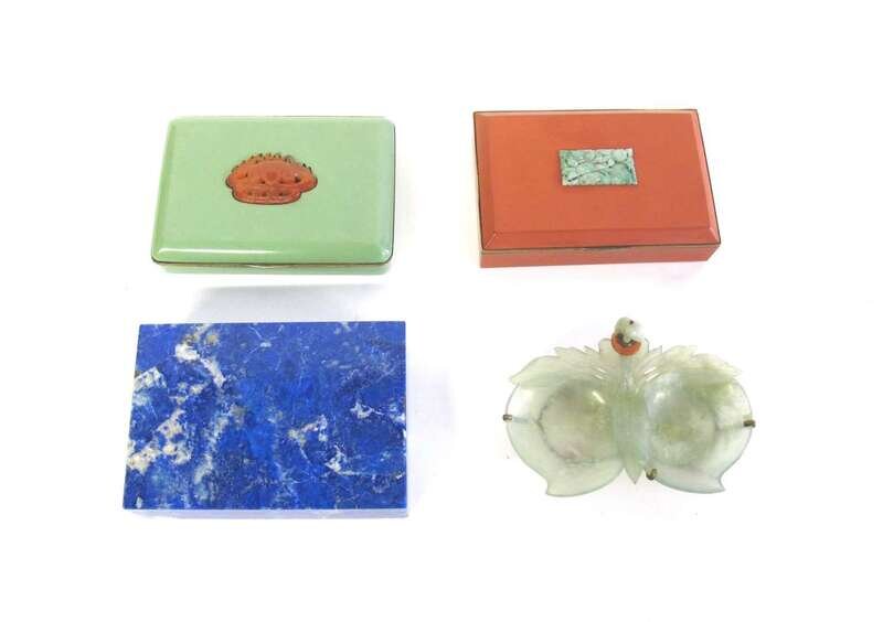 Including two enameled Yamanaka boxes, the tops inset with carved carnelian and jadeite; together with hinged lapis box and a double-basin dish of carved nephrite with an elephant finial on carnelian ball feet, the two boxes stamped YAMANAKA, MADE IN JAPAN.