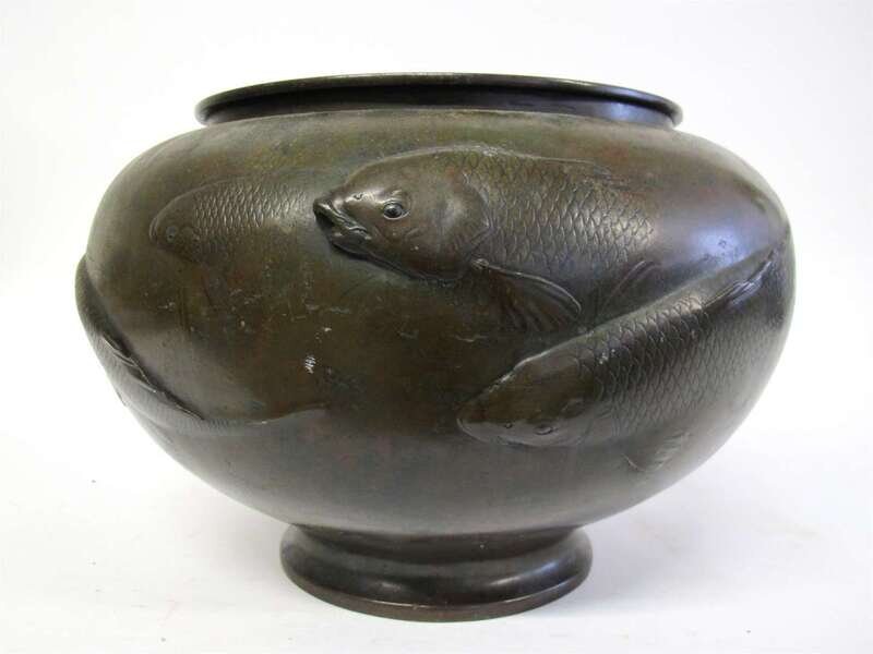 Squat bulbous form, cast to show koi in relief, signed to base.