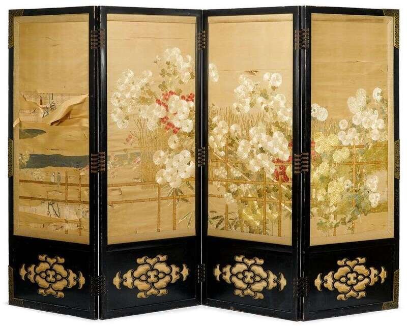 Comprising of four rectangular panels, each silk embroidered to depict flowers amongst a trellis, over a smaller arabesque carved and ebonized panel, each within an ebonized wood and brass mounted frame, the reverse with a woven silk brocade, complete with a set of keys to the box that originally contained the screen (now lost), and the key fob which bears the inscription of provenance.