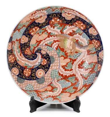 Painted with alternating swirl bands of geometric and foliate designs in red, blue and green, centrally painted with a phoenix, the reverse bordered in an underglaze blue double-pinwheel motif.
