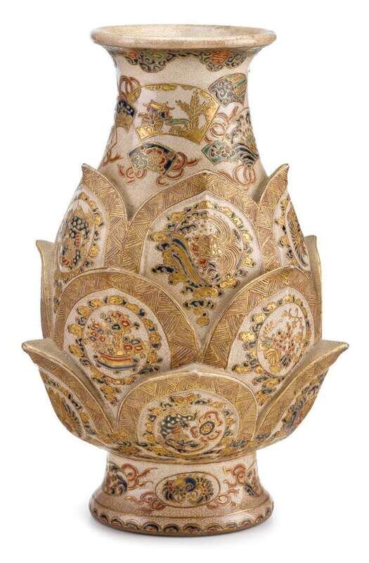 Baluster-form with three graduated tiers of lotus pedals decorated with floral and dragon medallions, the neck with fans and ribbons, signed.