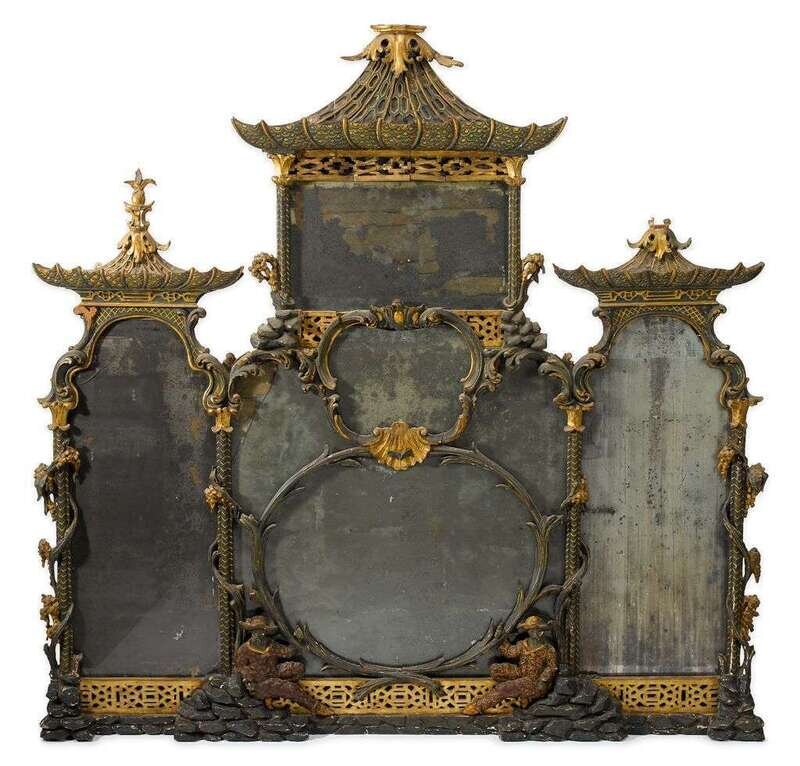 In the Chinese taste, of shaped triangular form and divided into three sections surmounted by pagoda tops, two carved figures of seated Chinaman at the lower edge, appears to retain orginal plate.