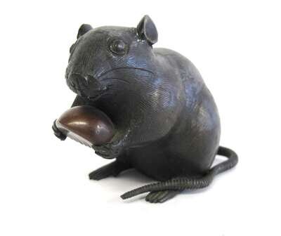 Bronze, brown patina, depicting a rat on its hind legs holding a chestnut, signed.