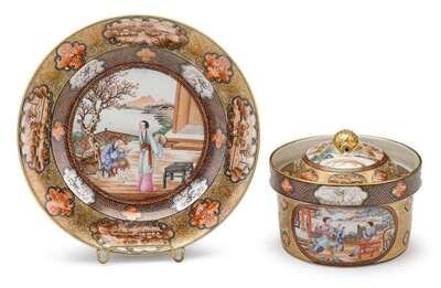 Fine Chinese export porcelain gilt and sepia decorated covered butter dish and undertray late 18th century