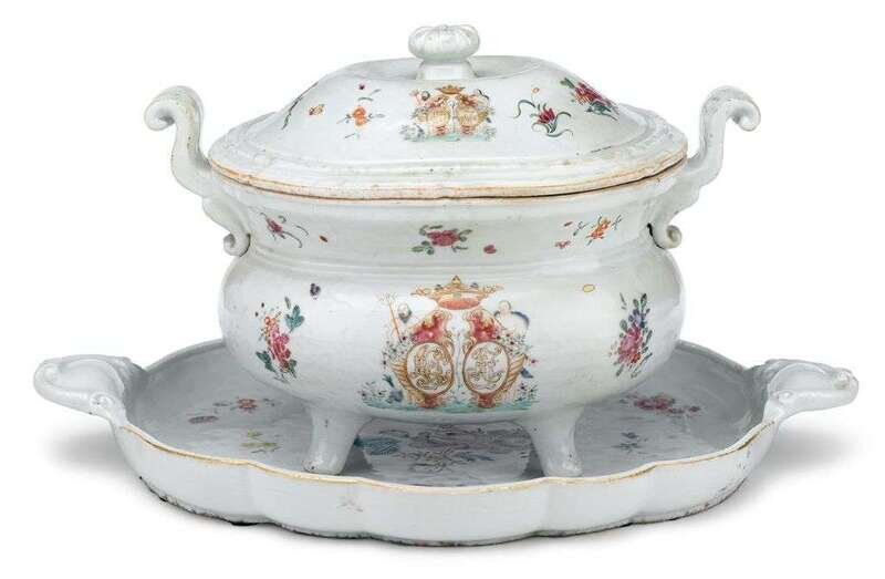 Chinese export porcelain armorial tureen and underplate for the Danish market circa 1760