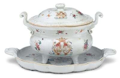 Oval-form domed lid over conforming body with twin scroll handles, terminating in four outswept feet, the undertray of scalloped oval form, both polychrome and gilt decorated with floral sprigs in the famille rose palette, with a cartouche of two oval medallions and monograms AES and AF for Anne Elisabeth Soelberg and Abraham Falck, flanked by figures of Neptune and Venus, surmounted by a three-prong crown. (2).