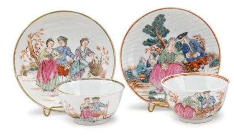 Two Chinese export porcelain polychrome decorated cups and saucers, Gardner & Wife and Courting Couple late 18th century