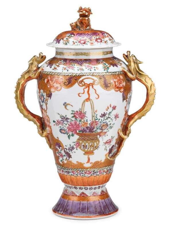 The urn-form body surmounted by twin gilt dragon handles, the domed lid with foo dog finial, the vase painted in the famille rose palette with hanging floral baskets framed in a foliate and geometric patterned ground.