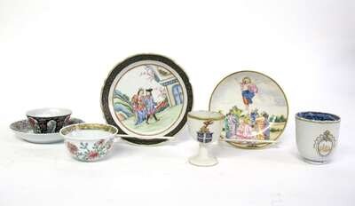 Including a Jesuit saucer, a saucer with courting couple, floral saucer with butterflies and beetles, two floral teacups, teacup with undreglaze blue border and monogram "REM" and an egg cup with armorial crest. (7).