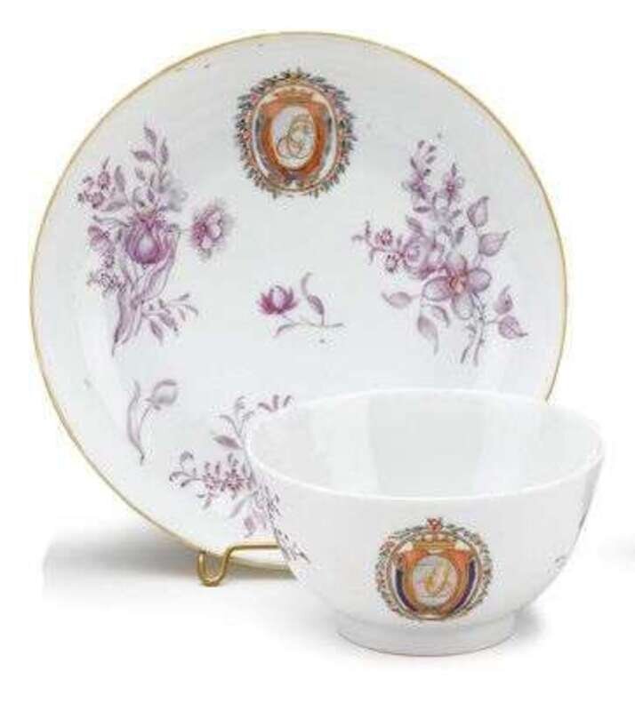 The circular U-shape cup and circular dished saucer painted with oval armorial crest with floral garland border and crown above monogram "CF", painted with purple floral sprigs.